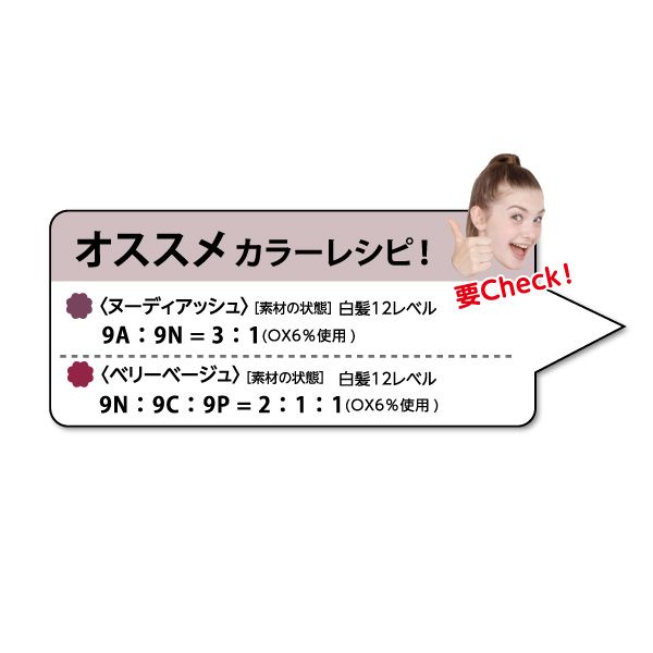 褪色が鮮やかで、髪色が持続。「カミツレエキス」「カンゾウエキス」配合で繰り返しカラーリングに優しい。アップル系のフルーティフローラルの香り。