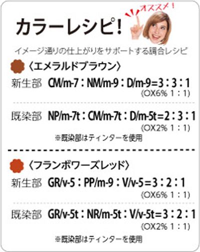 鮮やかでファッショナブルなVividcolor(高彩度ライン)、落ち着いた色味のModeratecolor(中彩度ライン)、グレイヘアをきれいに染めるDeepcolor(低彩度ライン)の3つのラインをひとつのブランドにラインアップ。ミックス自在で、ファッションカラーからファーストグレイカラー、グレイカラーに対応できる幅広いヘアカラーを実現。