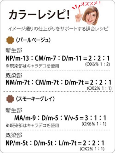 鮮やかでファッショナブルなVividcolor(高彩度ライン)、落ち着いた色味のModeratecolor(中彩度ライン)、グレイヘアをきれいに染めるDeepcolor(低彩度ライン)の3つのラインをひとつのブランドにラインアップ。ミックス自在で、ファッションカラーからファーストグレイカラー、グレイカラーに対応できる幅広いヘアカラーを実現。