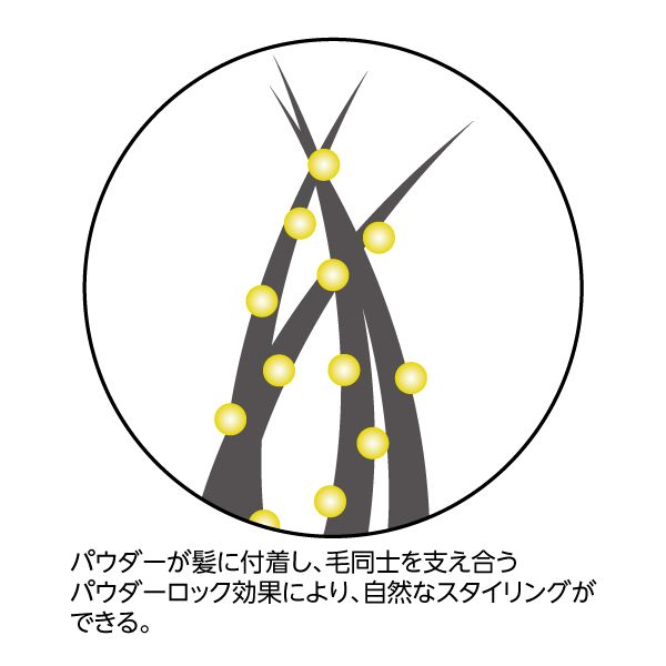 パウダーで髪をロック!ボリュームアップ、ダウンが何度でもきまる!ミネラル成分100%のパウダーで、ワックスのように固めず、自然な軽いスタイリングを実現。何度でもリセットできて、アレンジも自由自在!シトラスの香り。