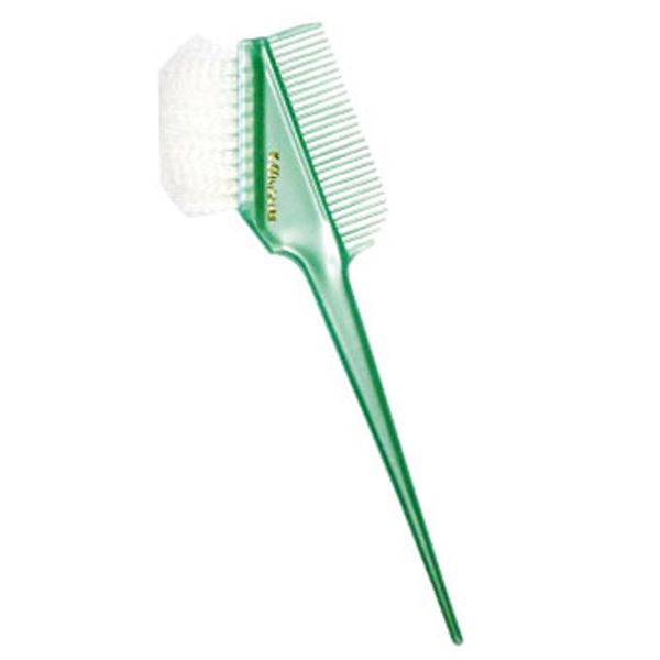 超ロングセラーのヘアダイコームブラシ。コーム部は毛の通りがよく薬液のすき落としがない中荒刃を使用。ブラシは液ダレを防止するため両サイドをカットした台形型。