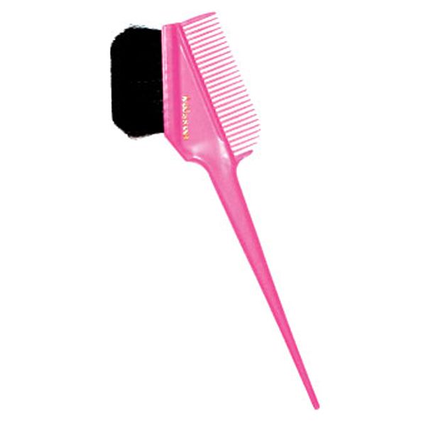 超ロングセラーのヘアダイコームブラシ。コーム部は毛の通りがよく薬液のすき落としがない中荒刃を使用。ブラシは液ダレを防止するため両サイドをカットした台形型。