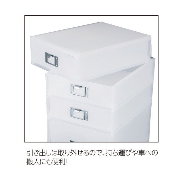 A4サイズの引き出しが、小3段・大2段の五段収納。大引き出しには仕切り付き。ネームプレート&キャスターも付いて使い勝手◎引き出しは取り外せるので、持ち運びや車への搬入にも便利!