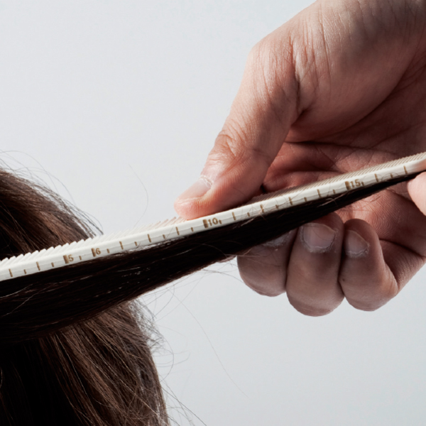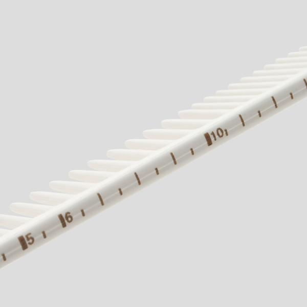 くぼみが頭にフィットし、直角が確認しやすい。両面に目盛がはいってるので、粗歯・密歯の両方向から計測が可能。国家試験必須長さの数値(6cm・10cm)が太字になっている。