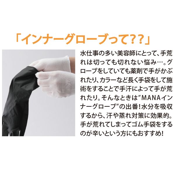 ゴム手袋の下に装着して手汗のベトベトを吸収!ゴム手袋の下にインナーグローブを装着して使用。洗濯して繰り返し使用が可能。