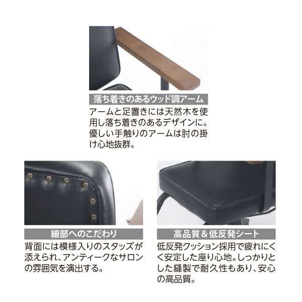アームと足置きには天然木を使用し落ち着きのあるデザインに。