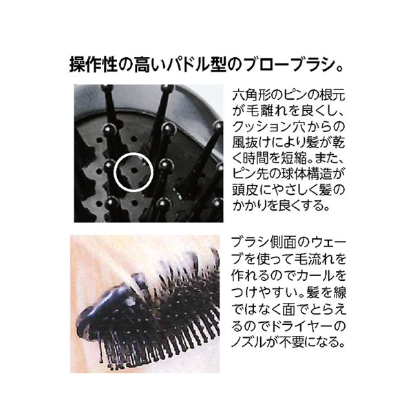 六角形のピンの根元が毛離れをよくし、クッション穴からの風抜けにより髪が乾く時間を短縮。また、ピン先の球体構造が頭皮にやさしく髪のかかりを良くする。