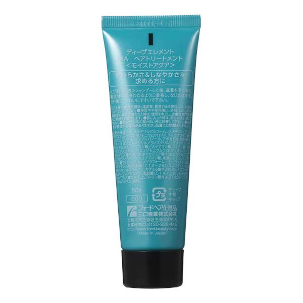 「ディープエレメント」シリーズは、髪をケアしスタイリングをサポートするベースメイクヘアケア。ハイパーナノCMC配合で、高保湿・高補修。MA(モイストアクア)は、しっとりと潤いベタつかない髪に仕上げる。