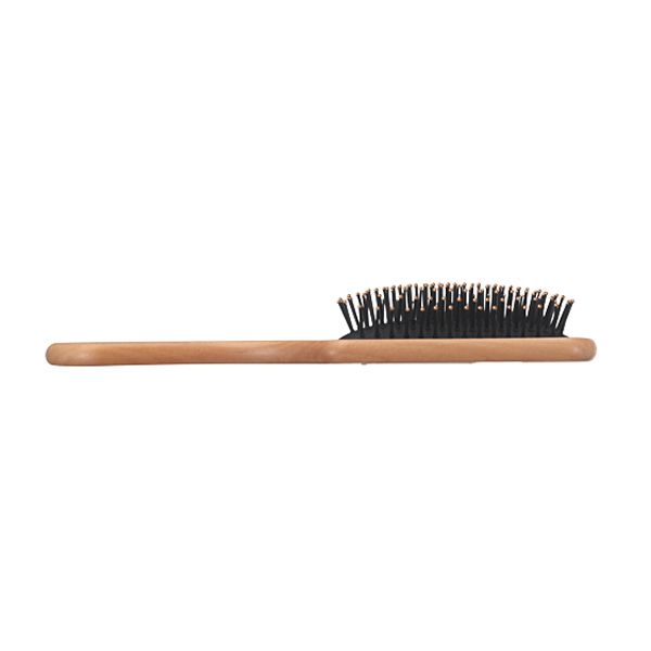 頭皮に適度な刺激を与える木製のパドルブラシ。木製の持ち手は手触りが良く、静電気を起こしにくい。
