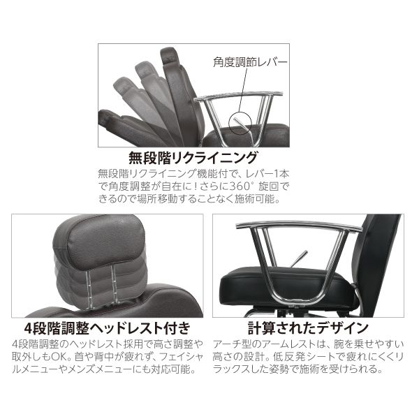 シャンプー、フェイシャルなど、幅狭な省スペース設計とソファのような座り心地で快適な時間を過ごせる。