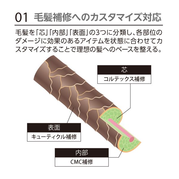 毛髪を「芯」「内部」「表面」の3つに分類し、各部位のダメージに効果のあるアイテムを状態に合わせてカスタマイズすることで理想の髪へのベースを整える。