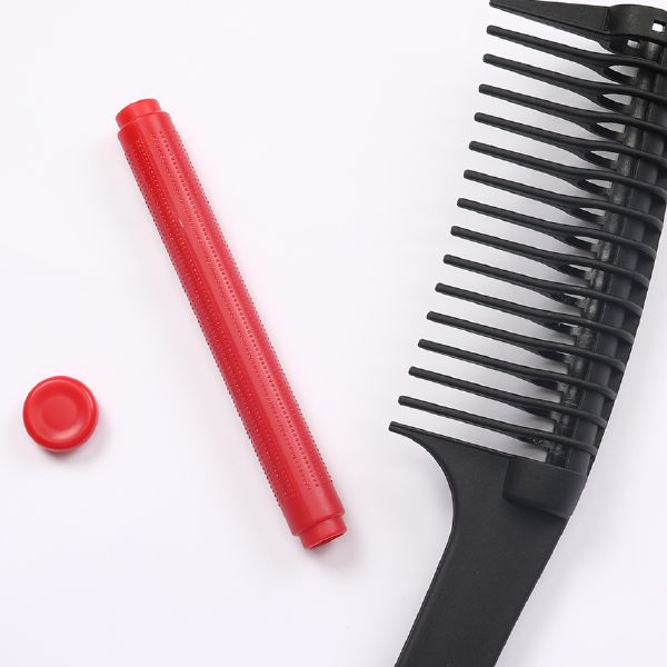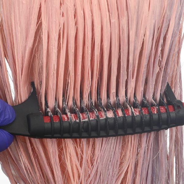 赤いローラー部の特殊構造で、コーミングの時にカラー剤を取りすぎず、コームの背の部分に薬剤がたまるのを解消する。