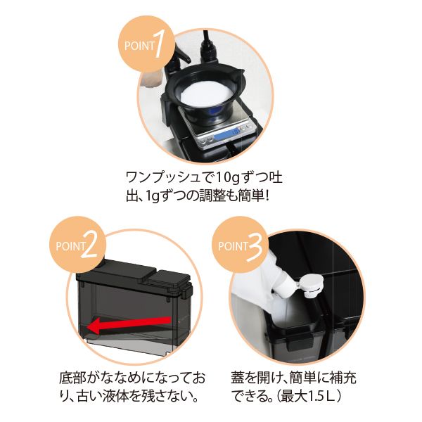 ワンプッシュで10gずつ吐出し、1gずつの調整も簡単にできる。