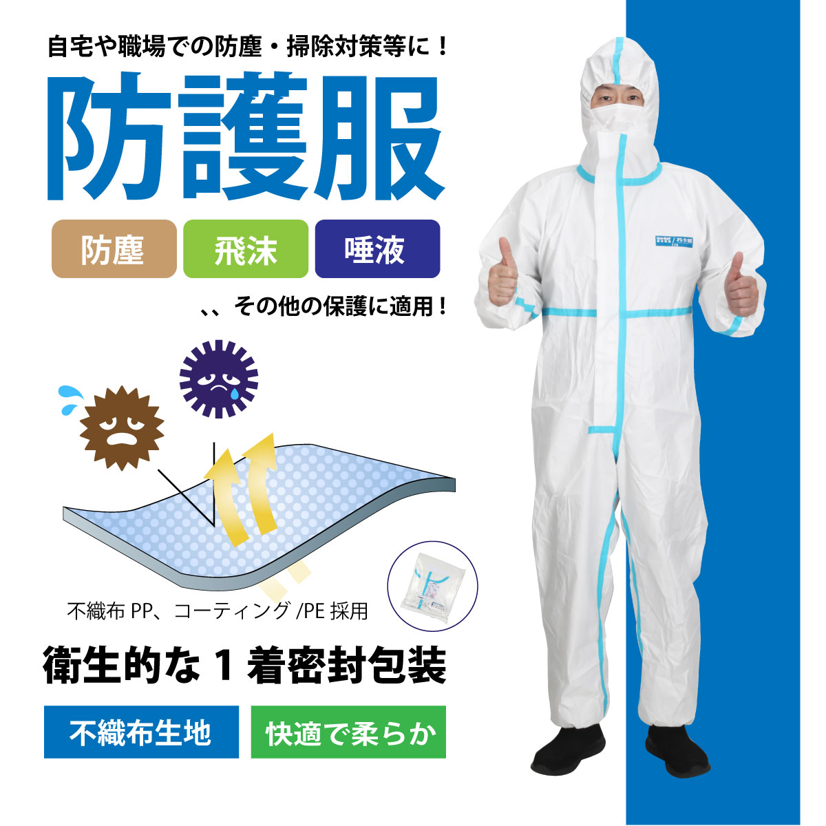 また、防護服は1着密封包装となっているから衛生的。