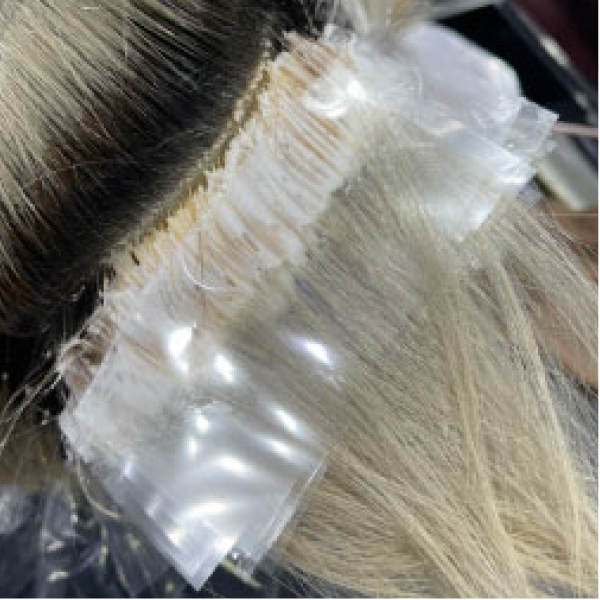 フィルムリタッチを使用することで薬剤の密着度がアップして、本来のブリーチ力を髪に与える。
