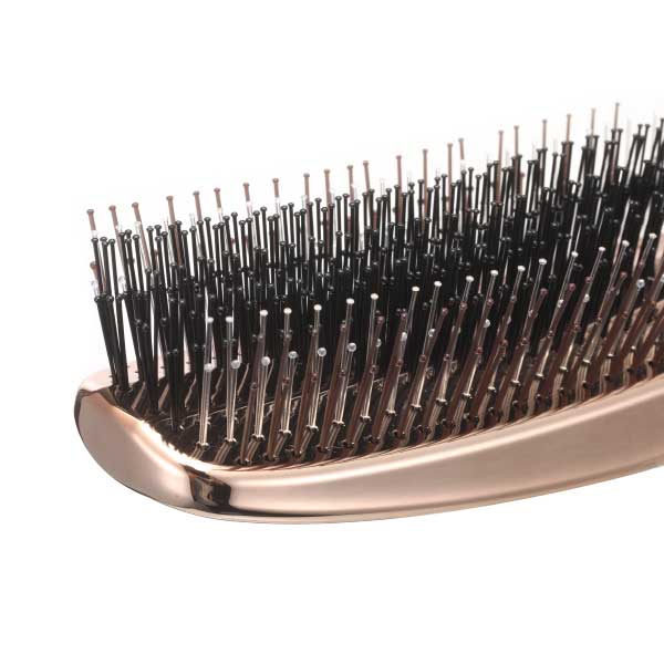 2種類の硬さの違うナイロンを使った段差植毛を採用で、毛穴にしっかり届きやすく、ブラシの先端が真球に近いので、頭皮を傷つけにくい。