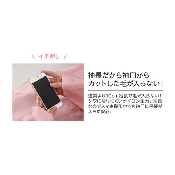 特別仕様の袖長タイプのカットクロス。袖口が深いので、カットした毛が袖口から入らず、お客様に不快な思いをさせない。