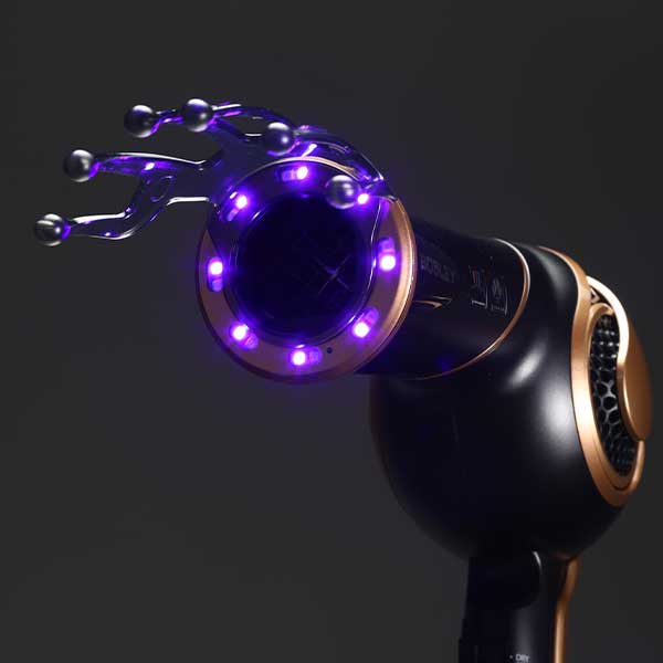 先端から毎秒数千万個のエクストライオンが発生し、イオンが毛髪を包み込んで枝毛の原因となる静電気を低減する。
