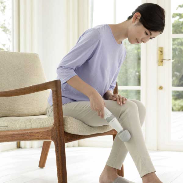 振動ヘッドでコリをほぐし、マッサージするコードレスマッサージャー。