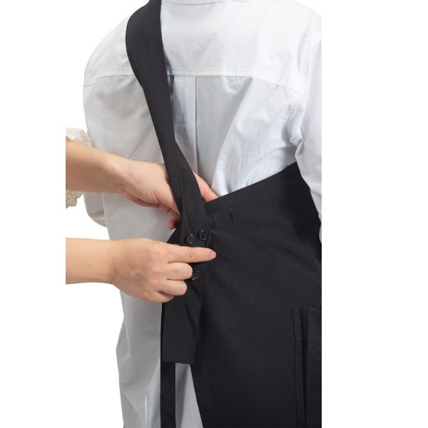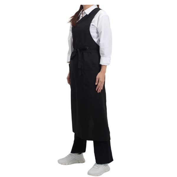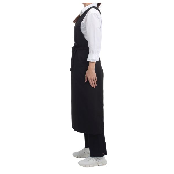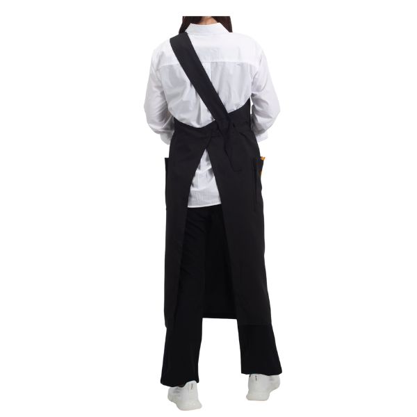 洗練された印象を与えるワンショルダーデザインのロングエプロン。