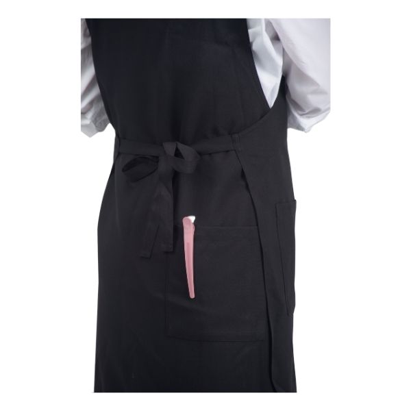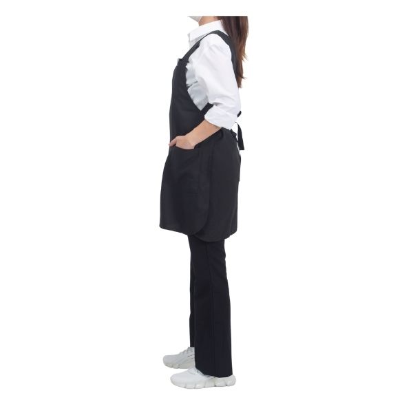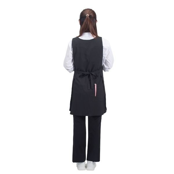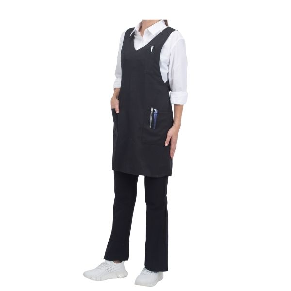 チュニック丈で裾にゆとりがあるため、エプロンの上からシザーケースを装着しても、シルエットが崩れず動きを邪魔しない。