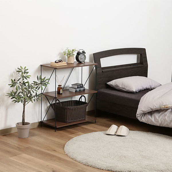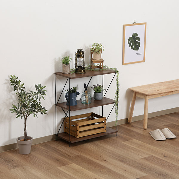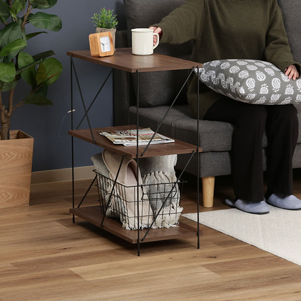 スタイリッシュなデザイン。木目調の棚板とブラックスチールのワイヤーフレームで、空間をカッコよく見せる。