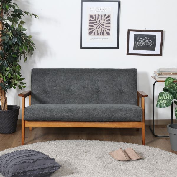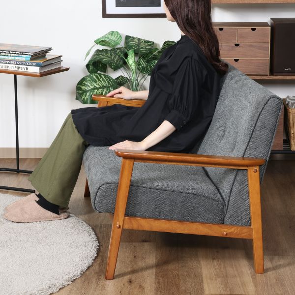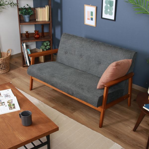 幅128×奥行72cmのコンパクトサイズで、一人暮らしにも最適な2人掛けソファ。細身のフレームで圧迫感がなく、ひじ掛けや傾斜のある座面が快適な座り心地を実現。