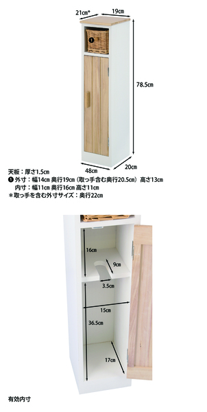 ●サイズ:全体/幅190mm × 奥行210mm × 高さ785mm、内寸/150mm x 170mm x 540mm、天板/190mm x 210mm、インナーバスケット/140mm x 190mm x 30mm、バスケット有効内寸/110mm x 160mm x 110mm