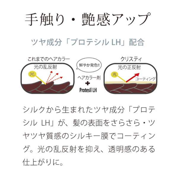 ツヤ成分(ナチュラルハイブリットポリマー成分)「プロテシルLH」に17種の植物成分配合。アルカリによる刺激が少なく、頭皮にやさしい。