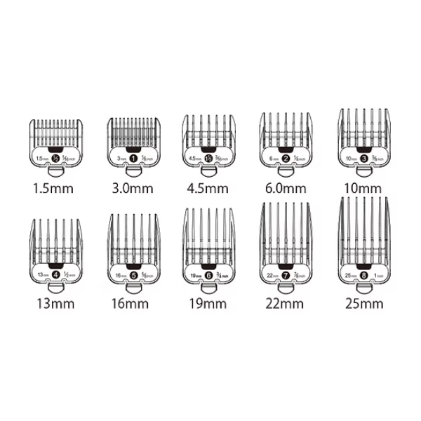 0.3mm / 0.7mm / 1.1mm / 1.5mm / 1.9mm。フェードスタイルなどの繊細な技術にも対応。