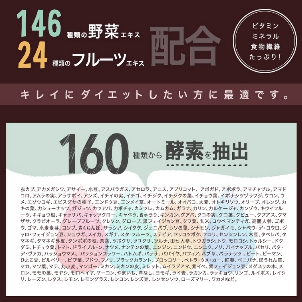 160種類以上の野菜や果物、野草、穀物、海藻を発酵させた酵素を使用し、置き換えダイエットはもちろん