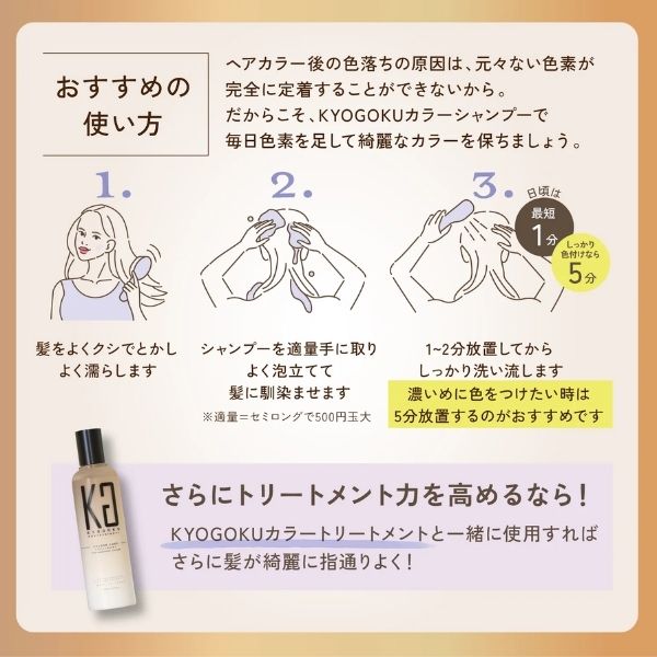 色素入りのシャンプーなので、いつものように髪を洗いながら自然に綺麗に染まる。(※髪の表面に一時的に着色)
