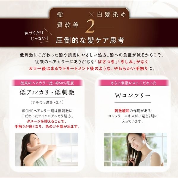 低アルカリ、低刺激。カラー後はまるでトリートメント後のような、やわらかい手触りに。
