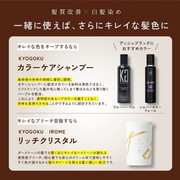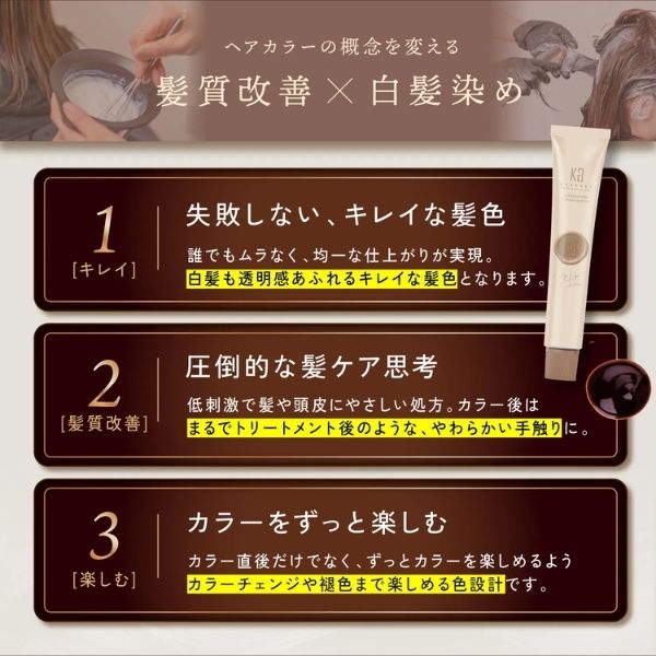 伸びのいいテクスチャで失敗しにくい。白髪も透明感あふれるキレイな髪色になる。