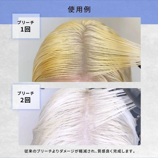 短時間でメラニンと酸化染料を効率良く分解。一度のブリーチ施術でより白に近い仕上がりを目指せる。