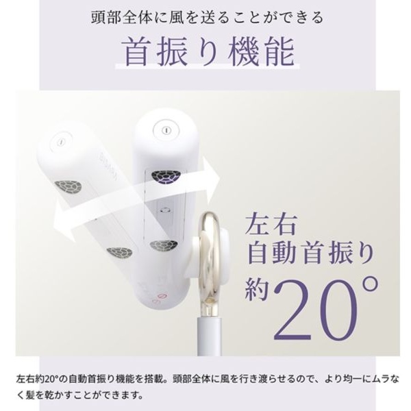 髪全体に風を送る、左右約20°の自動首振り機能を搭載。頭部全体に風が行き届くので、より均一にムラなく髪を乾かせる。