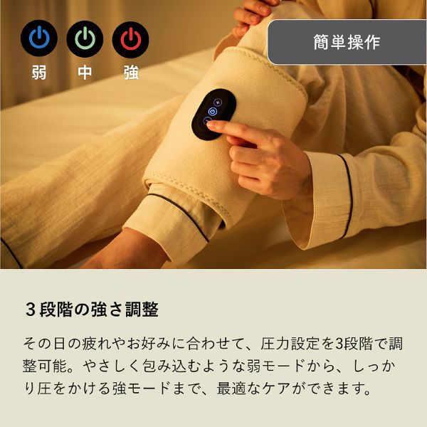 その日の疲れやお好みに合わせて、圧力設定を3段階で調整可能。やさしく包み込むような弱モードから、しっかり圧をかける強モードまで、足の状態に合わせた最適なケア。