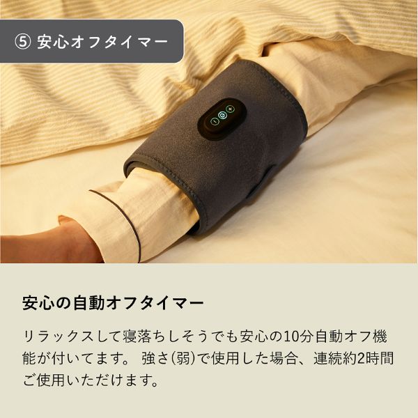リラックスして寝落ちしそうでも安心の10分タイマー機能が付き。約10分間稼働した後、電源が自動でオフになる。約3時間で充電は完了し、強さ(弱) で使用した場合、連続約2時間使用可能。