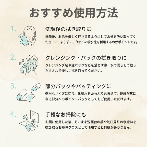 洗顔後、お肌を優しく押さえるようにして水分を吸い取ってください。こすらずに、タオルの吸水性を利用するのがポイントです。