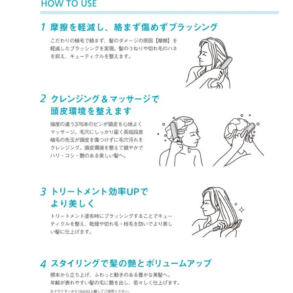トリートメント塗布時にブラッシングすることでキューティクルを整え、乾燥や切れ毛・枝毛を防いでより美しい髪に。