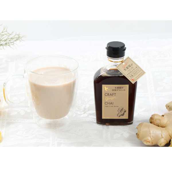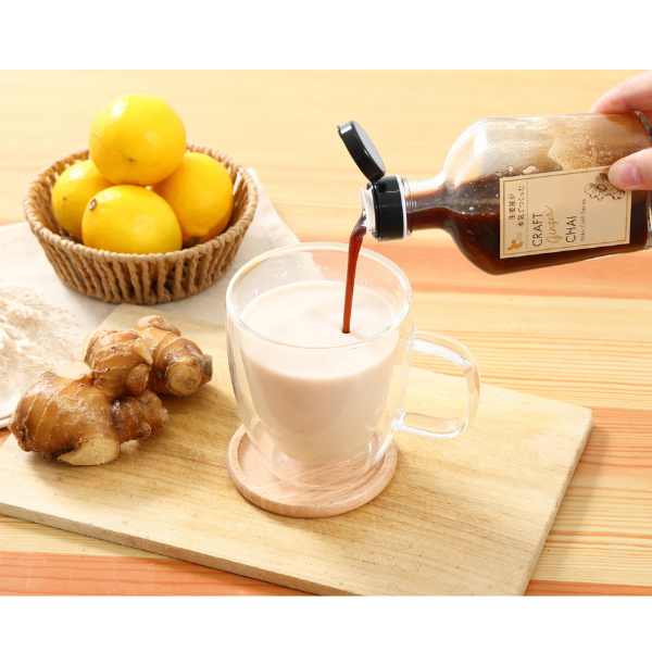 添加物(甘味料、保存料、着色料、香料)を一切使わず、紅茶の茶葉、シナモン、カルダモン、クローブ、生姜の4種類のスパイスに、砂糖大根といわれる甜菜から作られているビートグラニュー糖を加え煮出したチャイシロップ。