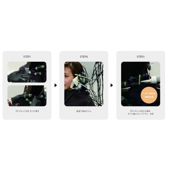 従来のデジタルパーマでは「1剤塗布→加温放置→水洗→タオルドライ→ワインディング」という工程が必要だが、デジキュア01はつけ巻きでそのまま加温放置が可能。