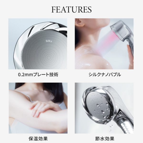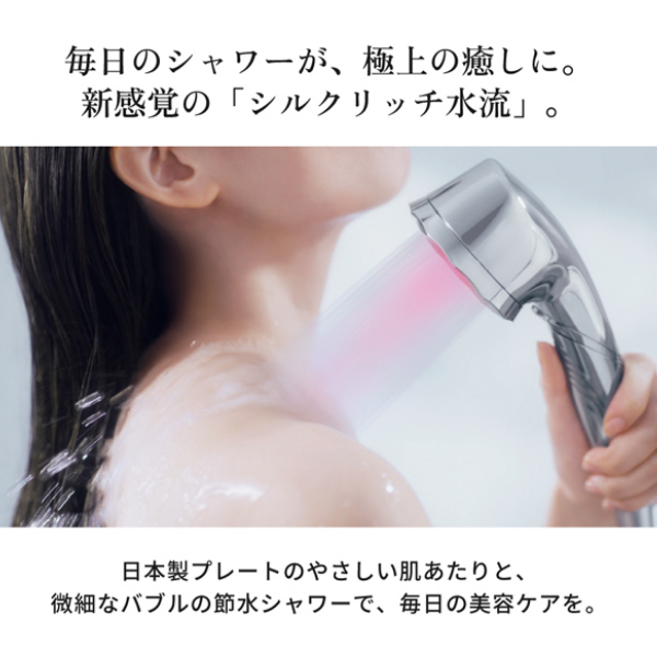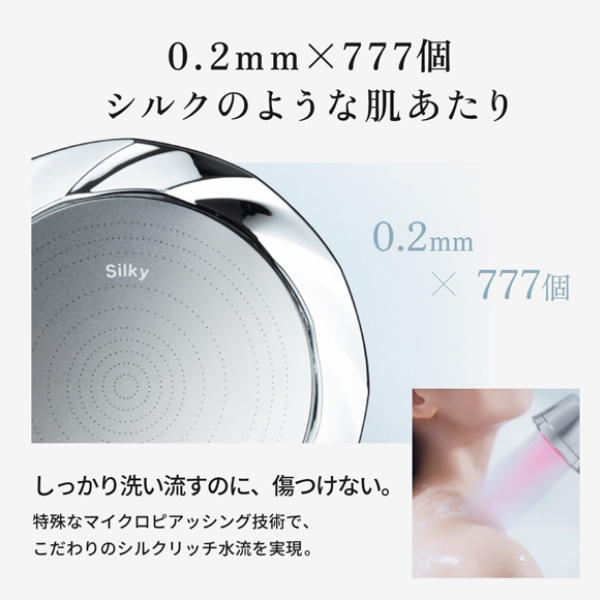 日本製プレートのやさしい肌あたりと、繊細なバブルの節水シャワーで、毎日の美容ケアを。 0.2mm×777個の極小ホールを、特殊なマイクロピアッシング技術で精密に加工。 まるでシルクのようなやさしい肌あたりと、しっかりとした洗い上がりを実現。