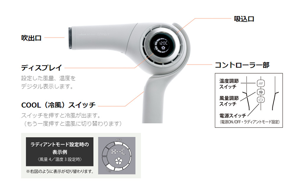 ドでそれぞれ風量 5 段階、温度 5 段階の全 25 段階 ×2 モードの50通りで髪質や仕上げに応じて細かな調整が可能。