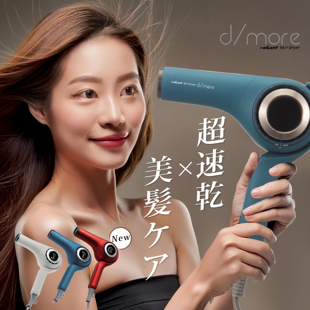 大好評のヘアアイロン radiant より、5年の試行錯誤を繰り返し、ようやく、超速乾を追及しトルクフルな温風を実現したヘアドライヤーの『d/more』が誕生しました。ドライヤーの一番の悩みである乾かすのに時間がかかる難点を圧倒的大風量で解決。 プロのヘアパーツモデルさんも大絶賛の風量にこだわったドライヤーです。